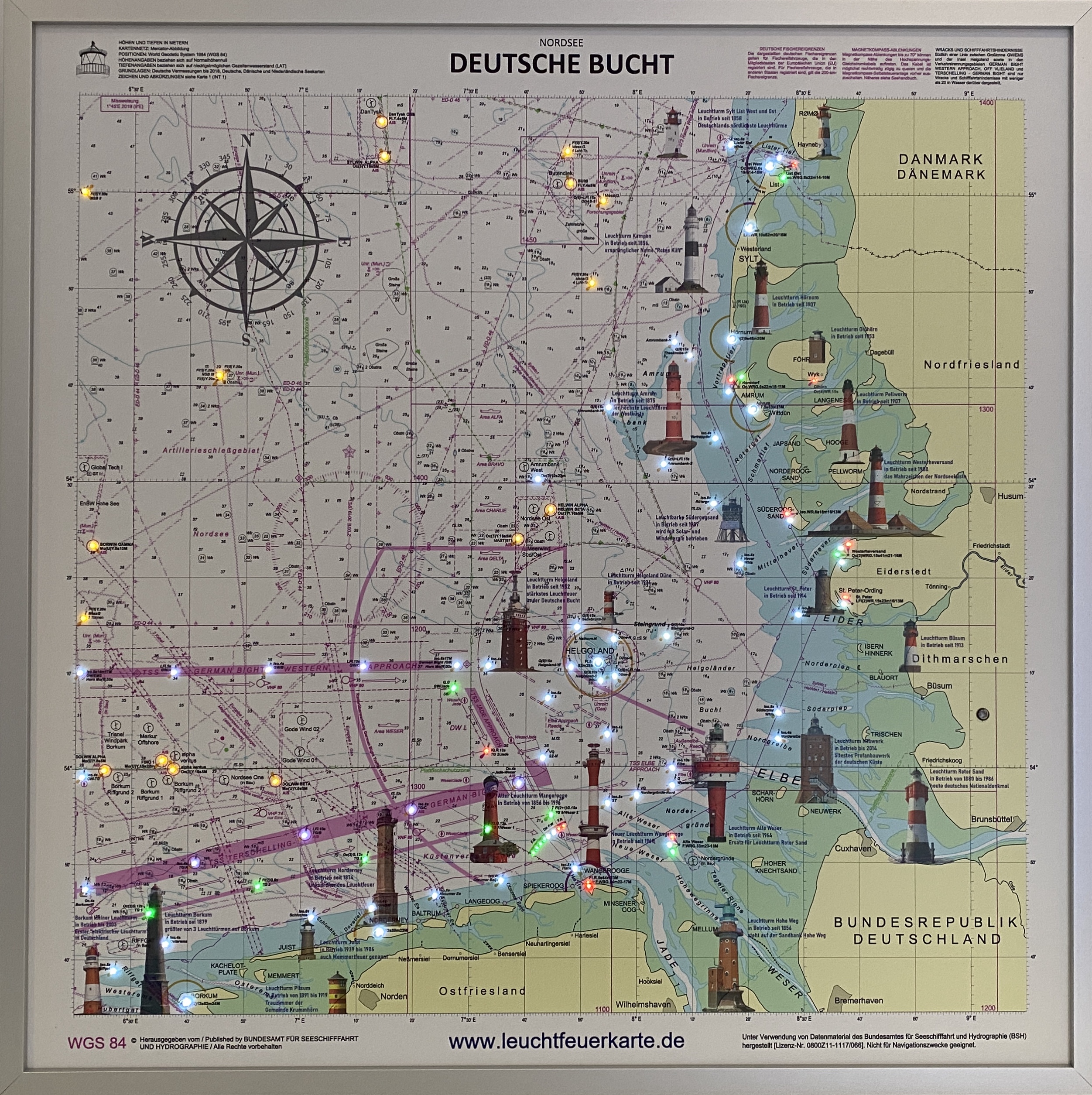Leuchtfeuerkarten sind Seekarten mit original blinkenden Leuchtfeuern (Leuchttürme und andere Leuchtfeuer) der Nordsee und Ostsee. Zahlreiche LED's und eine Vielzahl von Optionen verwandeln Seekarten u.a. des Bundesamtes für Seeschifffahrt und Hydrographie (BSH) in einzigartige illuminierte / beleuchtete Seekarten.