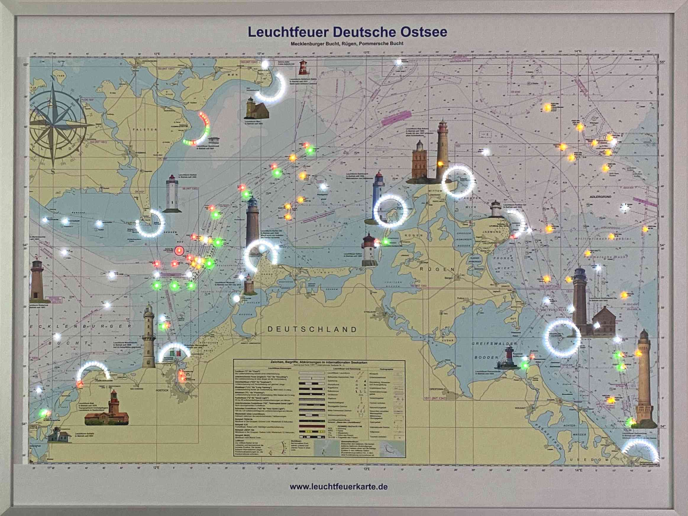 Die östliche Ostseeküste in der Ausführung "Leuchttürme Deutsche Ostsee" mit 23 mit original Kennung blinkenden Leuchttürme im Vordergrund (Format 70x50 cm).
