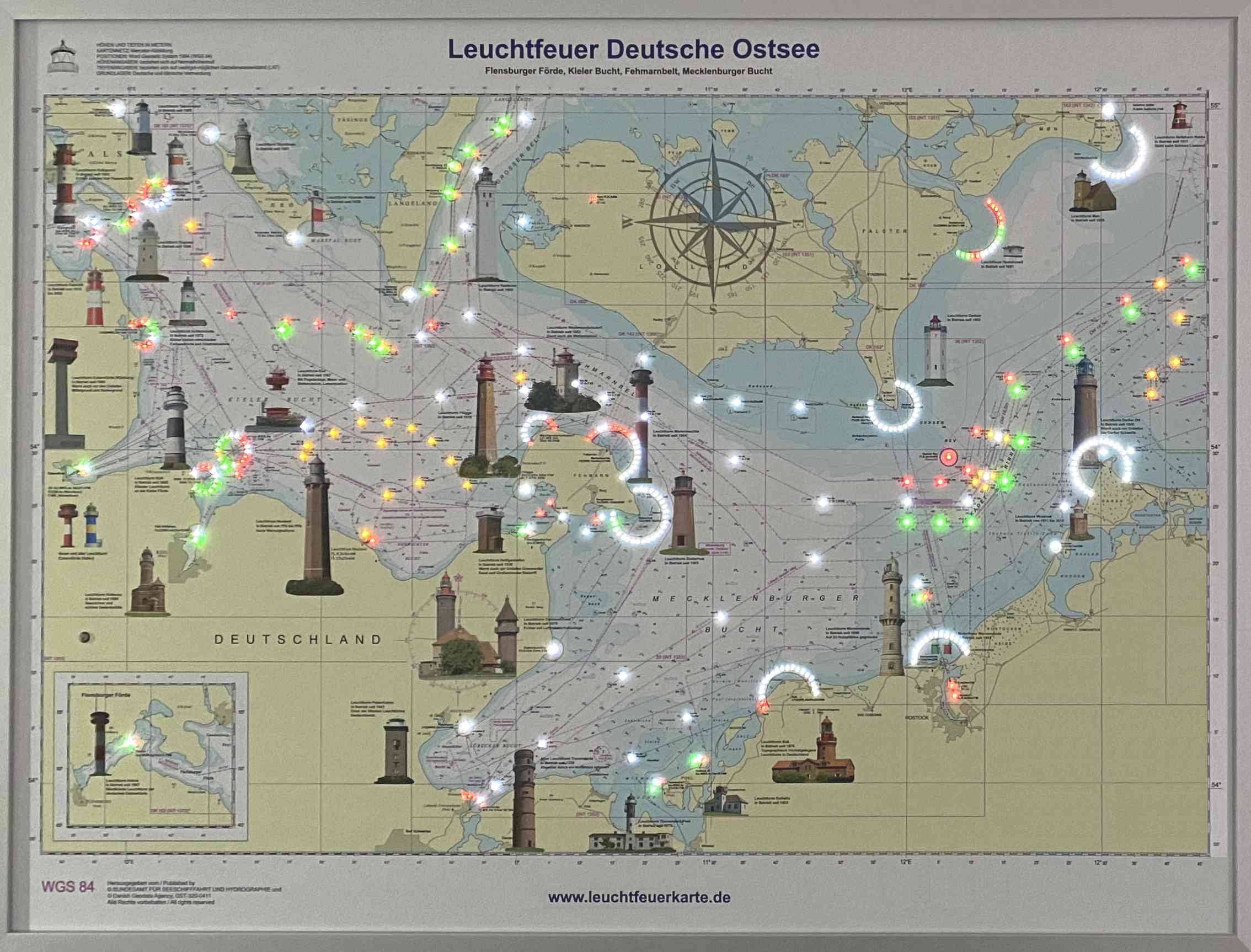 Die westliche Ostseeküste in der Ausführung "Leuchttürme Deutsche Ostsee" mit 32 mit original Kennung blinkenden Leuchttürme im Vordergrund (Format 70x50 cm).