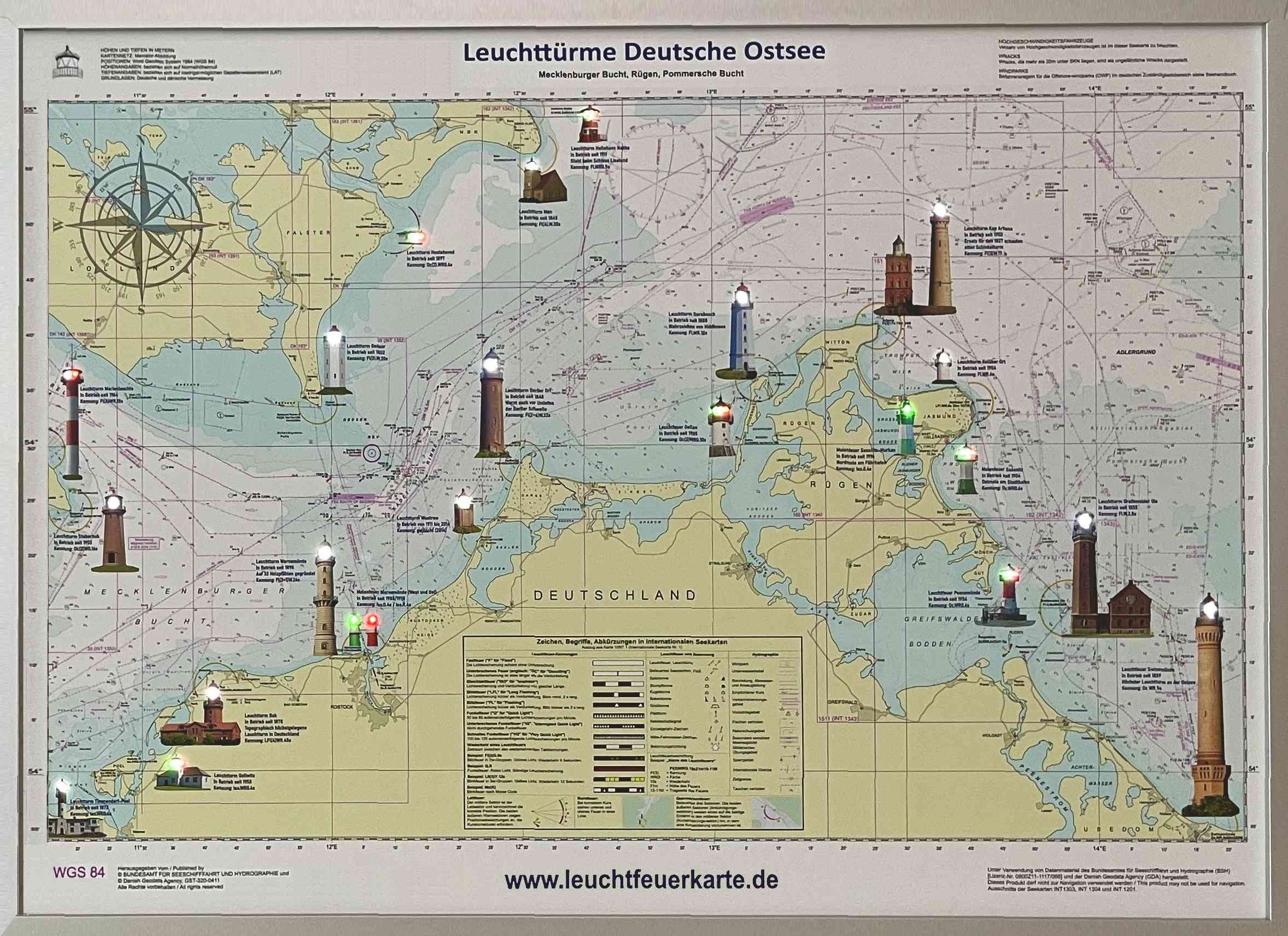 Die Leuchtfeuerkarte "Leuchtfeuer Deutsche Ostsee" zeigt im Format 80x60 cm die östliche Ostseeküste (Mecklenburger Bucht, Rügen, Pommersche Bucht). Basis sind die BSH-Seekarten INT 1201 und INT 1304. Es ist ein Ausschnitt der Leuchtfeuerkarte Deutsche Ostsee.